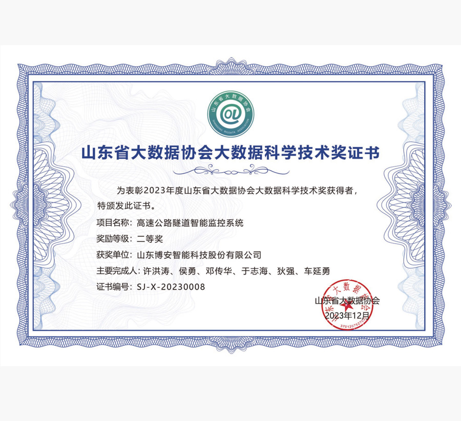 山東省大數據協會大數據科學技術獎證書