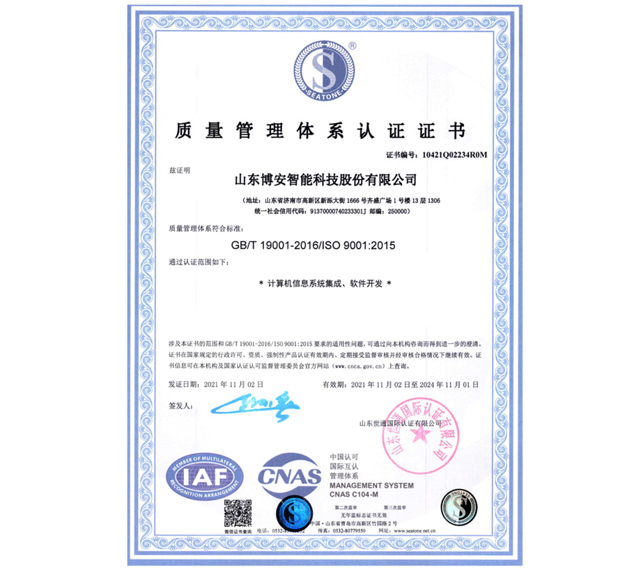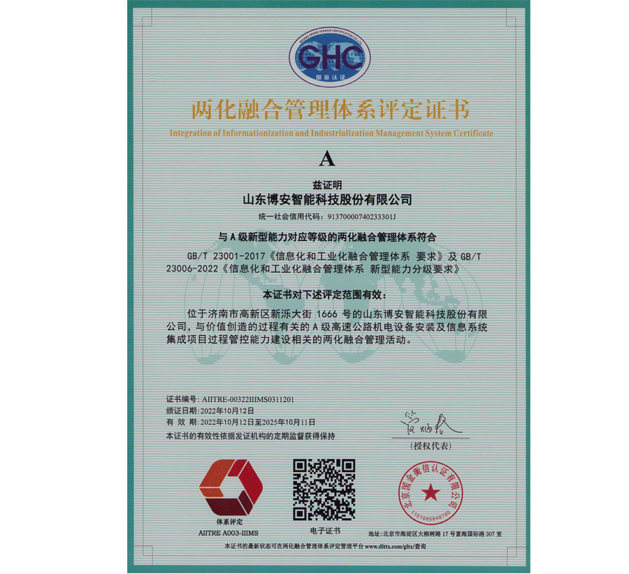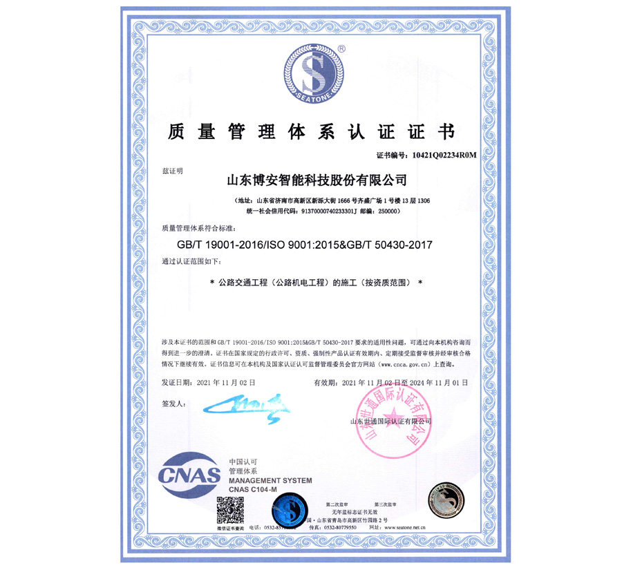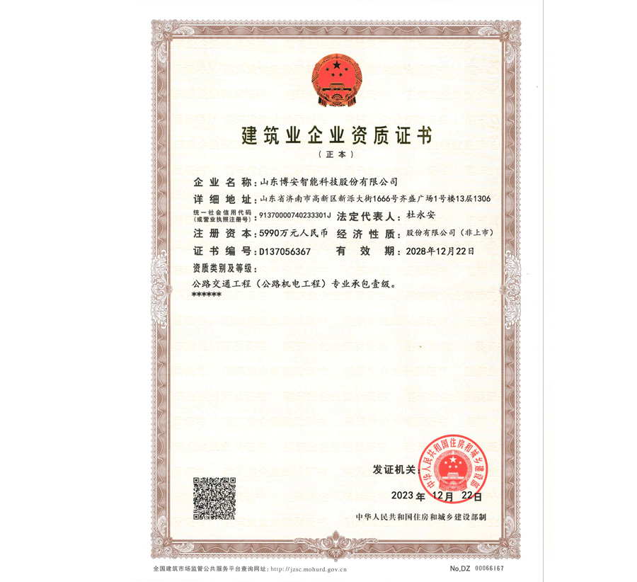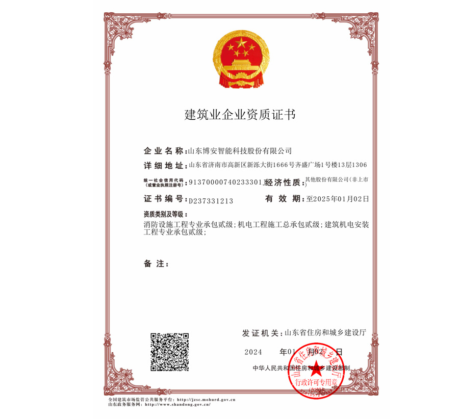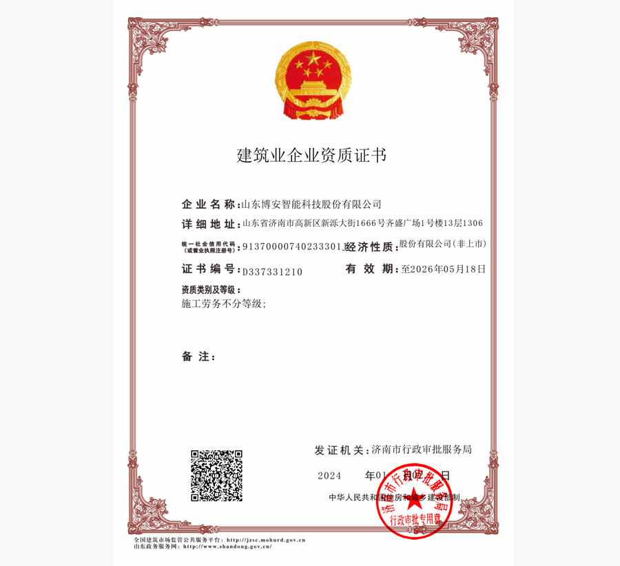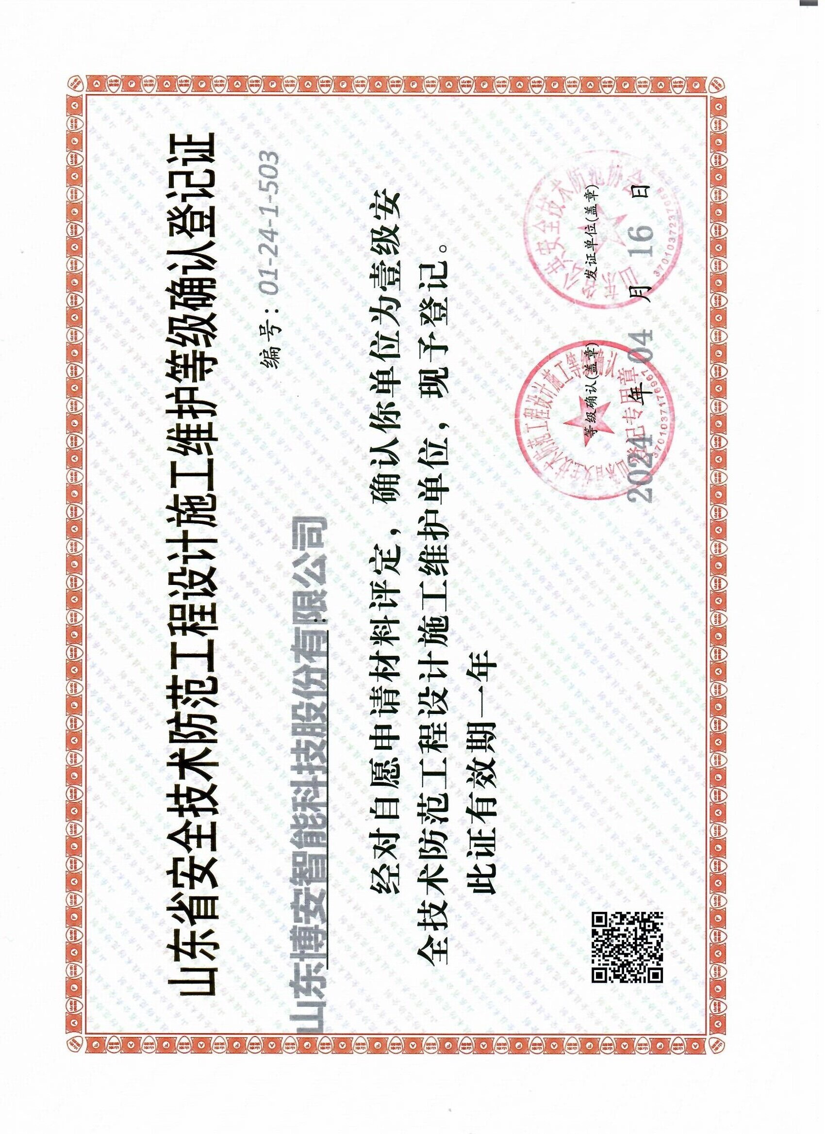 山東省安全技術防范工程設計施工維護等級確認登記證壹級