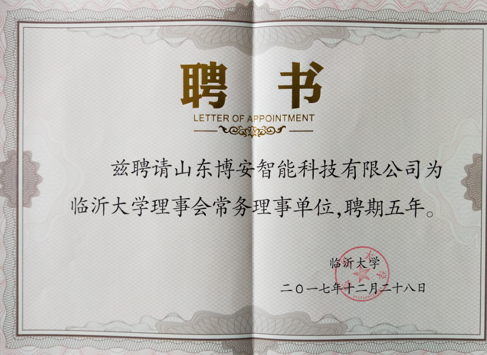 12月28日,博安智能應邀參加了臨沂大學理事會成立大會。會議產生臨沂大學第一屆理事會理事,審議通過《臨沂大學理事會章程(草案)》,選舉產生臨沂大學理事會領導機構。